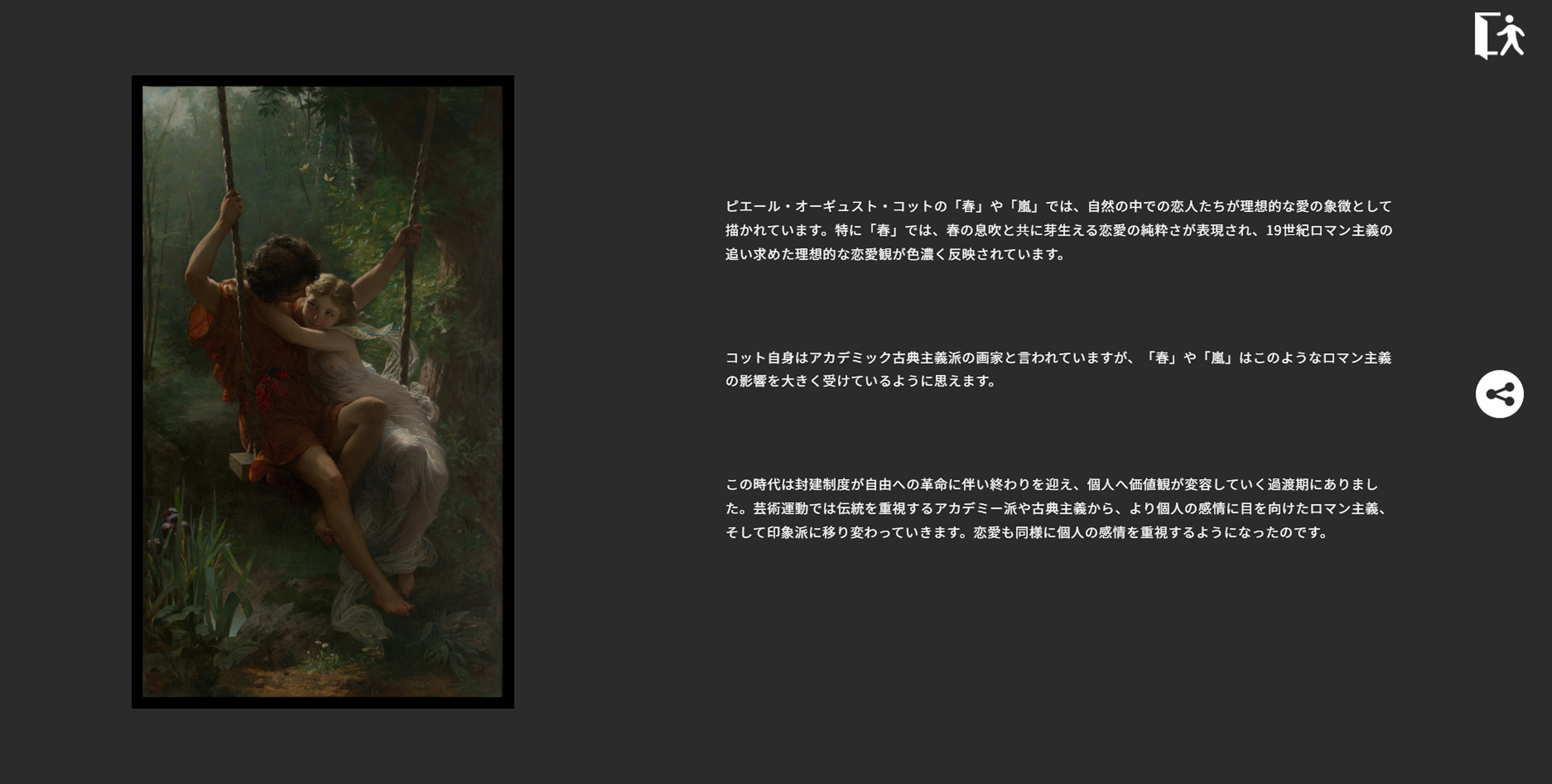 コンテンツとしてはオンライン展示会を採用して、『身近な関心』と『美術作品の背景』を繋げることで知的好奇心のベクトルを芸術に向けることをネライにしました。 オンライン展示会のページでは、黒を基調として横スクロールを採用することで変化を設け、他のページとは違い鑑賞のためのページだとわかるようにしました。スマートフォンでは、縦向きの場合に横向きの閲覧を推奨するメッセージを添えています。